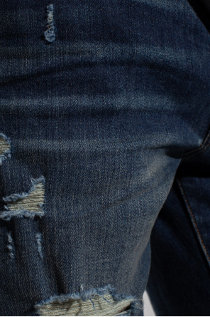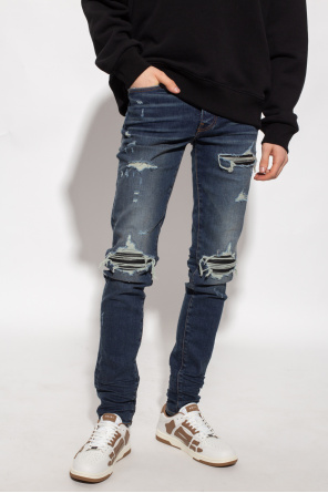 Navy blue ‘MX1’ skinny jeans from Amiri. Distinguished by distressed detailing and quilted leather inserts, this pair features button fastenings, classic five pockets and a black logo patch at the back.