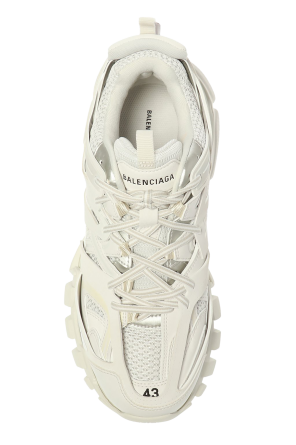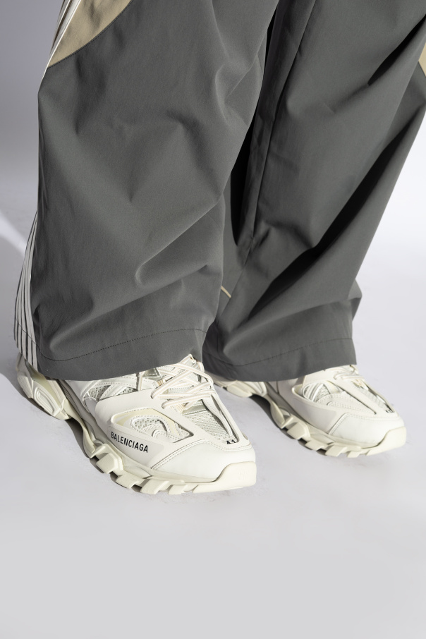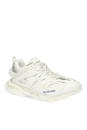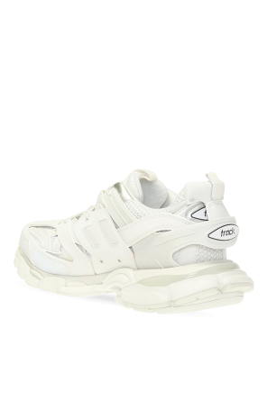 Balenciaga的白色Track系带运动鞋,饰以黑色印花标识。白色橡胶鞋底。