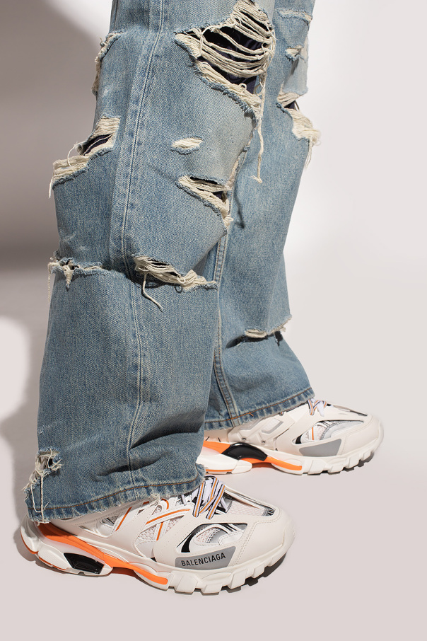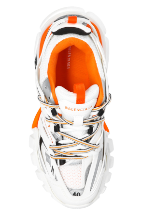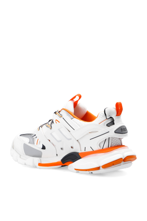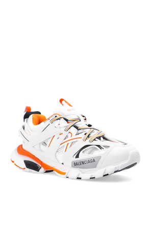 White and orange ‘Track’ sneakers from Balenciaga. Embossed with the brand's logo, this lace-up pair sits on a white and orange rubber sole and features a multi-layered, panelled upper with cut-outs for the trekking shoe reference.