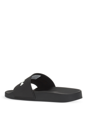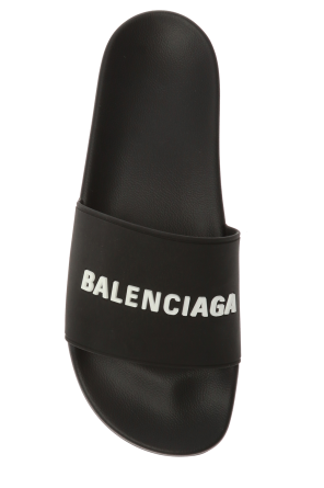Balenciaga的黑色拖鞋。采用白色凸起徽标装饰。