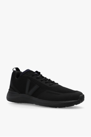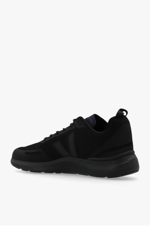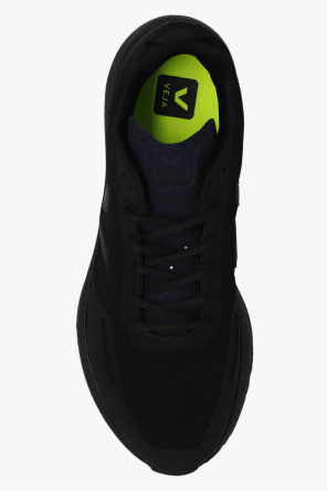 Black ‘Impala’ ultra-light sneakers from Veja. The upper is crafted from recycled fabric employing Eng-Mesh technology, which allows for custom placement of breathable and supportive zones. The lace-up model features an embossed logo on the tongue, the brand’s signature white V patch and rubber trims produced from bio materials such as sugar cane, castor oil and recycled materials. L-Foam latex insert is made of natural latex. The pair rests on a 60% sugar cane midsole with a black and khaki outsole made of Amazon rubber and rice waste.