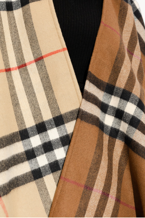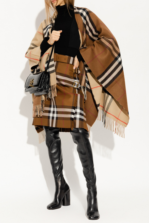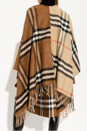 Beige and brown poncho from Burberry. Crafted from a wool and cashmere blend, this item showcases the brand's signature colourful check pattern and a fringed hem.