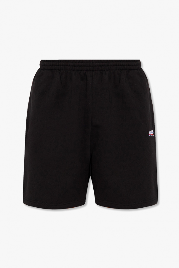 Black sweat shorts from Balenciaga. Made of cotton, this pair is complete with an elastic waistband with drawstrings on the inside, white and red logo embroidery and two slip pockets.