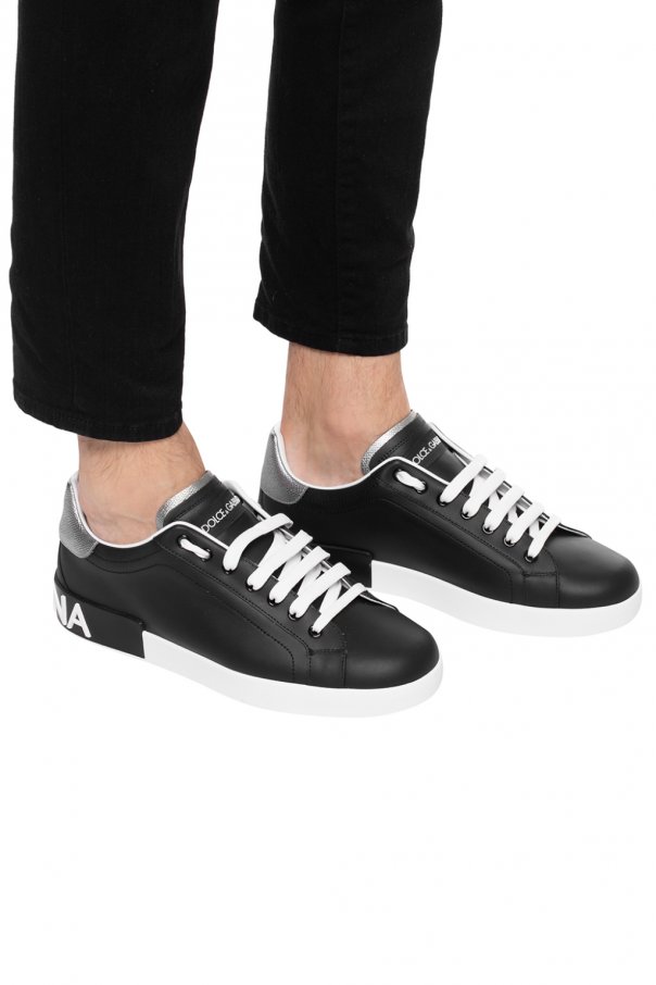 这款黑色真皮系带运动鞋来自Dolce & Gabbana,饰以黑白色标识贴花与银色拼接。白色橡胶鞋底。