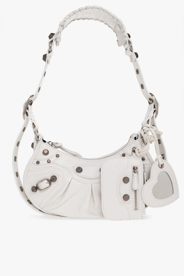 White ‘Le Cagole XS’ shoulder bag from Balenciaga. Crafted from leather, this design secures with a zipper with long fringes and showcases metal rivets, decorative buckles, an adjustable strap, a logo-embossed charm with a heart-shaped mirror, a zipped card holder, silver-tone metal hardware and one internal compartment.