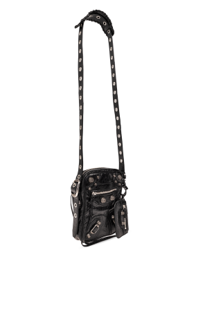 Black ‘Le Cagole’ shoulder bag from Balenciaga. Made of lamb leather with a vintage effect, this model is complete with a zip fastening, front zip pocket, slip back pocket, metal studs and buckles, adjustable shoulder strap, one internal compartment and silver-tone metal hardware. Comes with a detachable snap-fastened earphones case and a card holder.