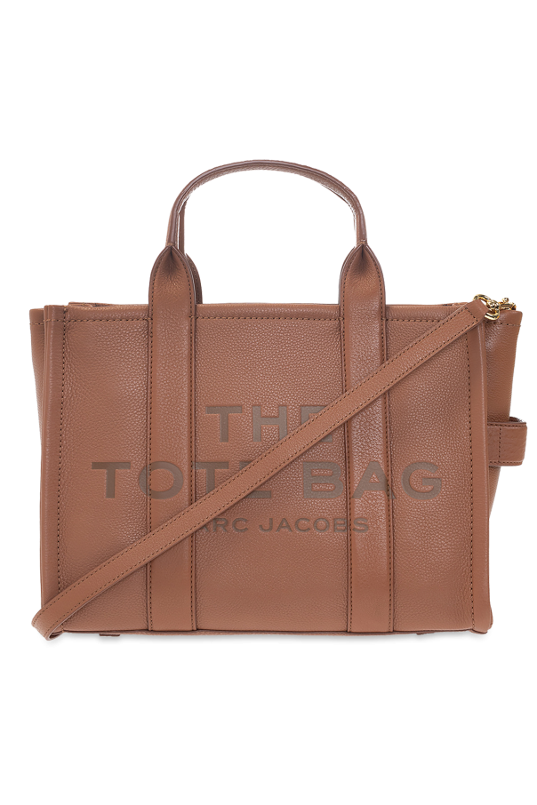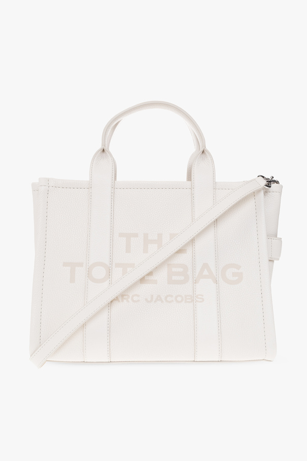 Grey and beige ‘The Medium Tote’ shoulder bag from Marc Jacobs. Crafted from textured leather, this design fastens via a zipper and showcases a printed logo, two half-round handles, a detachable and adjustable shoulder strap, gold-tone metal hardware and one internal compartment with two slip pockets, one zipped pocket and a card slot.
