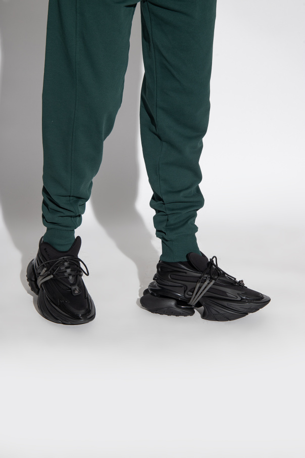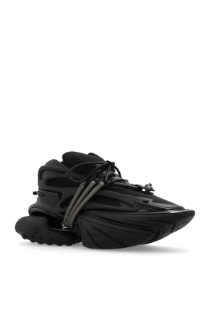 Black ‘B-Bold’ sneakers from Balmain. Crafted from leather and fabric overlays, this lace-up model sits on a black rubber sole and showcases a tonal black graphic print with the brand's logo.