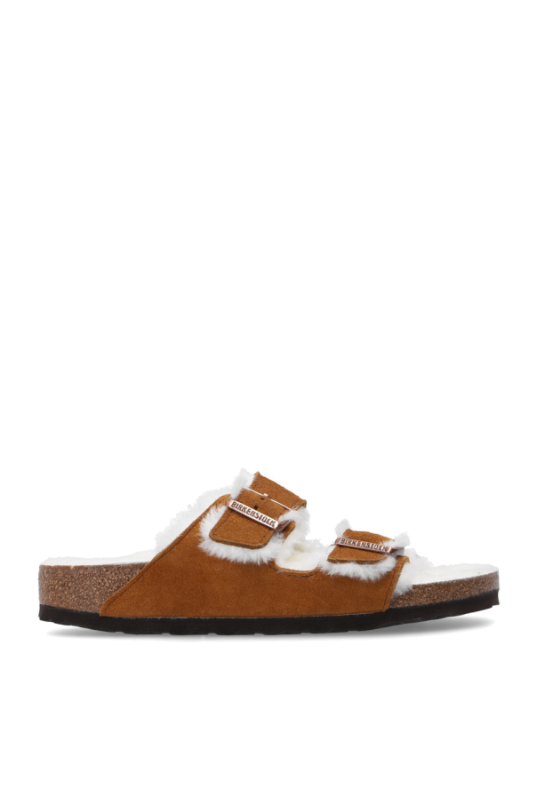 Birkenstock的棕色Arizona Fur拖鞋。绒面革质。附饰带,含复古金色调logo搭扣。白色皮草一体衬里。棕色及黑色的软木和EVA泡沫质鞋底。