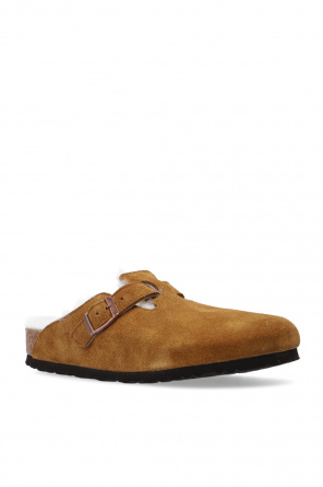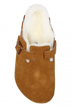 Brown ‘Boston VL’ slides from Birkenstock. This pair has a standard width upper with strap, antique gold-tone buckle with an embossed logo, white sheep shearling lining and brown sole constructed from natural cork and EVA foam.