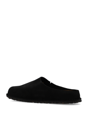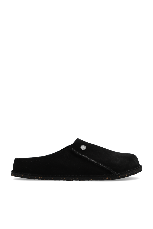 Black 'Zermatt Premium' slides from Birkenstock. Made of suede, this model sits on a black rubber sole and features an embossed logo on the side and an anatomically-shaped cork-latex footbed. Regular width.