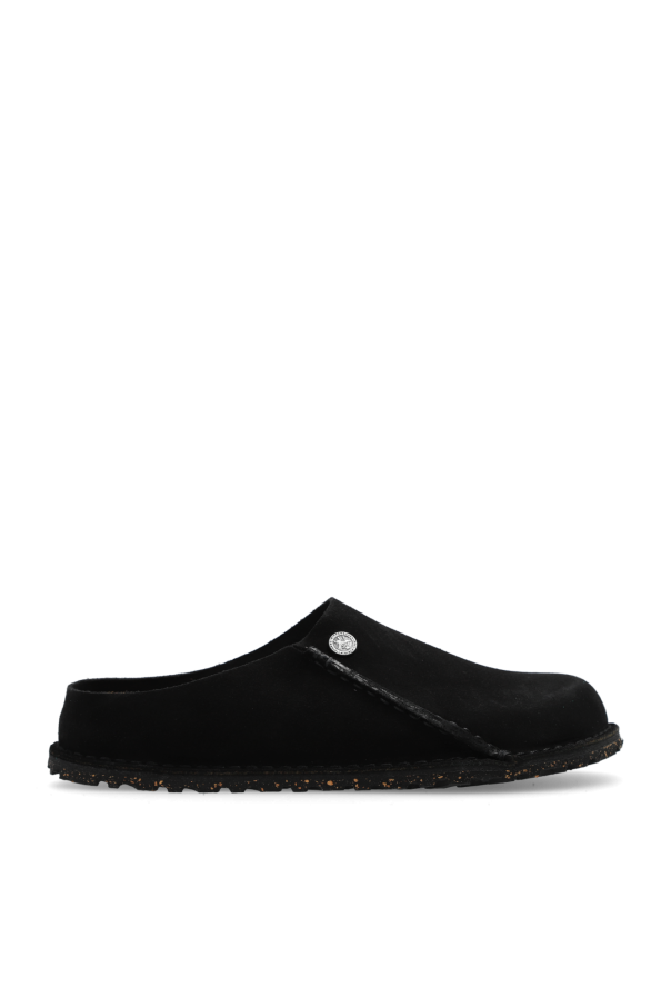 Black 'Zermatt Premium' slides from Birkenstock. Made of suede, this model sits on a black rubber sole and features an embossed logo on the side and an anatomically-shaped cork-latex footbed. Narrow width.