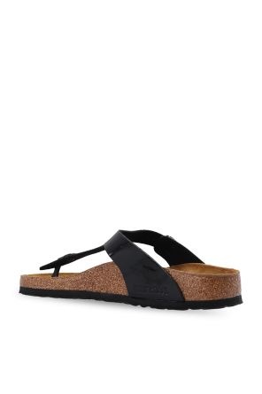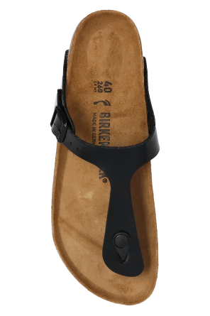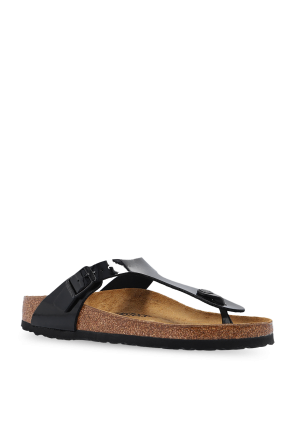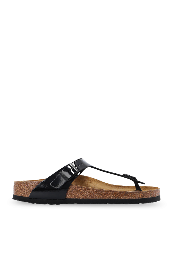 Birkenstock 黑色“Gizeh BS”拖鞋。 这双鞋采用亲肤专利 Birko-Flor® 制成,配有带徽标的可调节搭扣带和由软木和 EVA 泡沫制成的深棕色鞋底。