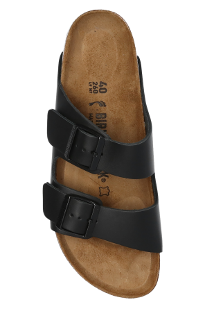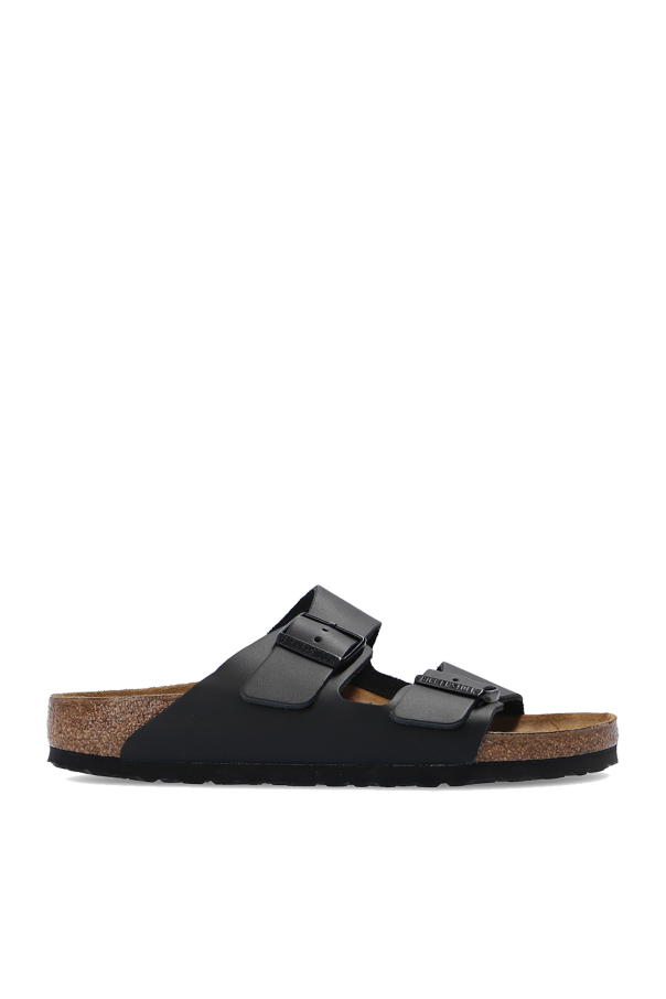 Birkenstock的黑色Arizona BS拖鞋。皮革质。附饰带,附含黑色logo的搭扣。棕色及黑色的鞋底由软木及EVA泡沫制成。