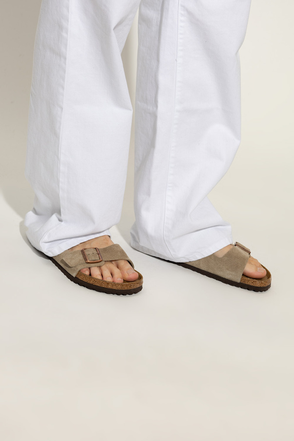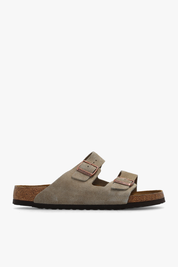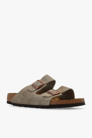 Greyish beige ‘Arizona BS’ slides from Birkenstock. Made of suede, this pair features adjustable shoulder straps, embossed logo, anatomically shaped cork-latex footbed and brown sole constructed from natural cork and EVA foam.