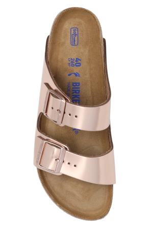 Birkenstock的金色金属Arizona BS拖鞋。 此款采用皮革制成,配有带徽标压花搭扣的可调节肩带以及由软木和 EVA 泡沫制成的棕色和白色鞋底。
