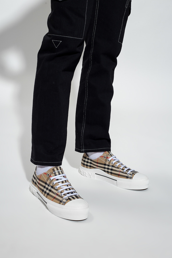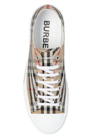 Beige sneakers from Burberry. Made of canvas with a colourful Vintage check pattern, this lace-up model features a logo print, raised logo detailing and a brown and white rubber sole.