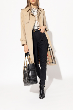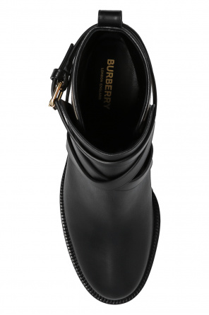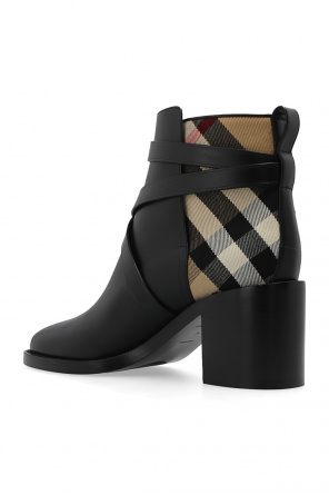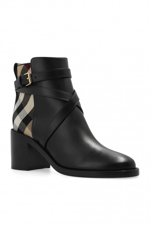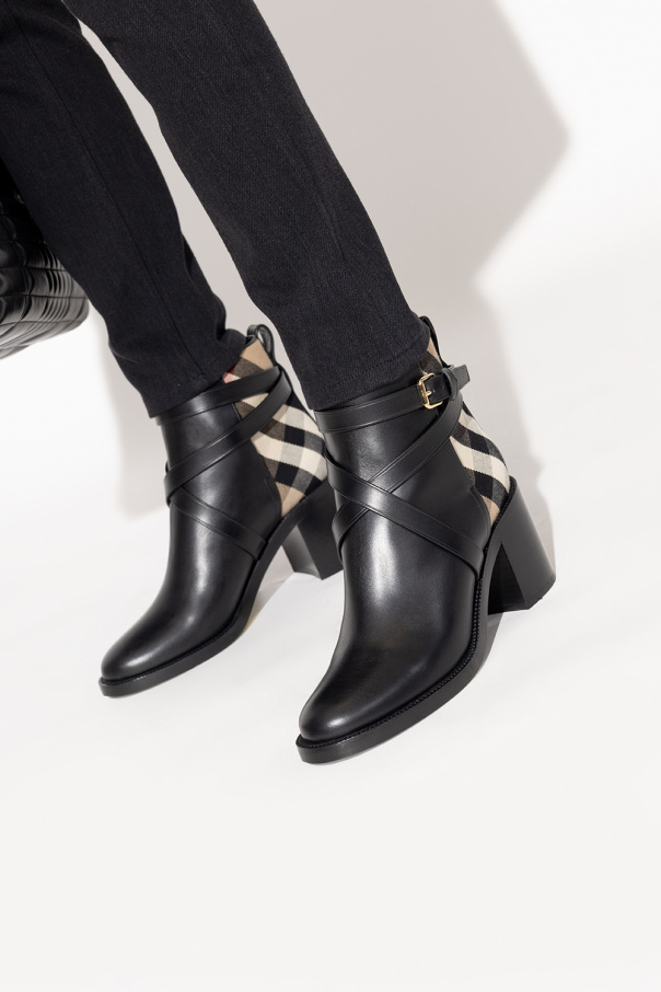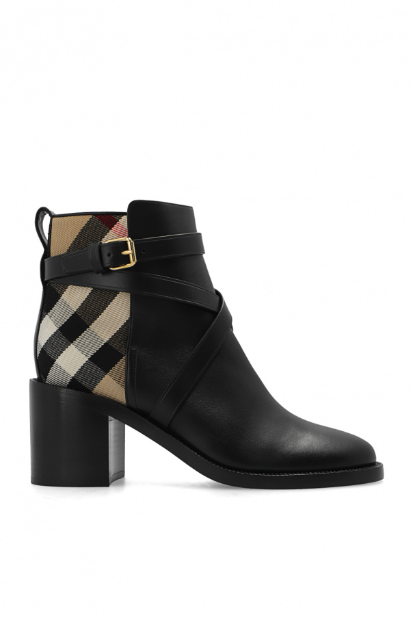 Burberry的黑色'New Pryle'高跟踝靴。采用皮革制成,饰有米色织物罩层,饰有标志性的白色、黑色和红色格纹图案,穿套式设计,脚踝处有可调节搭扣带,圆头,黑色皮革鞋底和橡胶。
