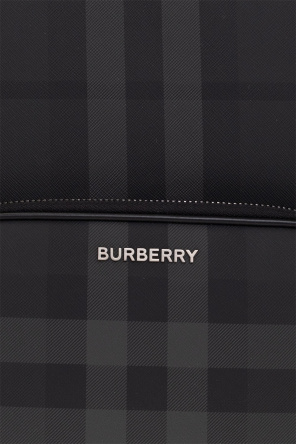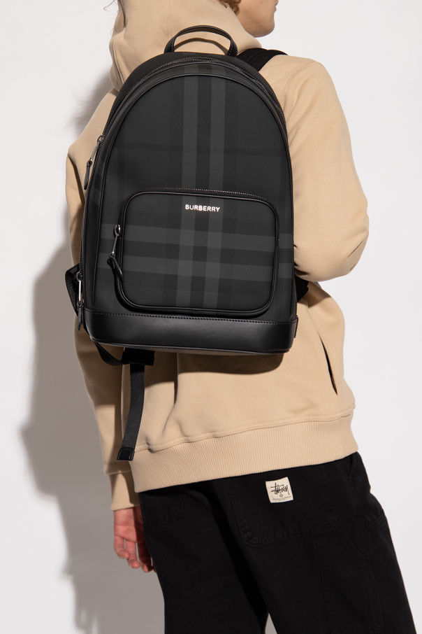 Black and grey ‘Rocco’ backpack from Burberry. Crafted from canvas with a signature, colourful check pattern, this design fastens with a two-way zipper and features a zip pocket accompanied with a metal logo plaque on the front, calf leather trims, a half-round handle, adjustable shoulder straps and one internal compartment with a slip pocket.