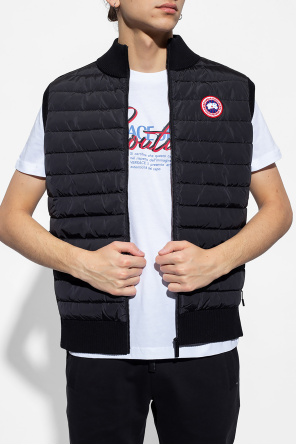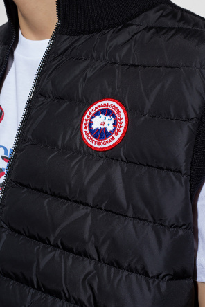 Black quilted vest from Canada Goose. Fastened with a zipper, this style features a down-filled front, a wool back, two vertical zip pockets and a navy blue, red and white logo appliqué on the front.