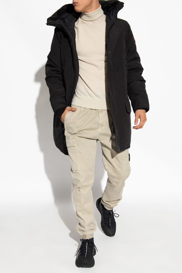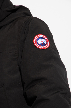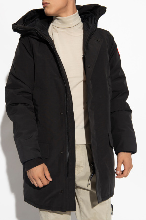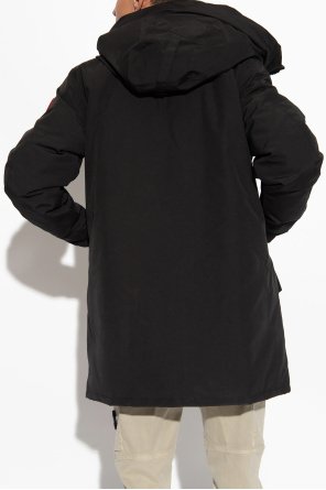 Black ‘Langford’ hooded down jacket from Canada Goose. Made of Arctic Tech®. Fastened with a two-way zip and snaps, this garment features a multicolored sleeve patch with a logo, drawstring hood, two snap-fastened flap pockets, two slip pockets, internal shoulder straps with a logo and long sleeves with adjustable ribbed cuffs. Temperature range: -15°C / -25°C.