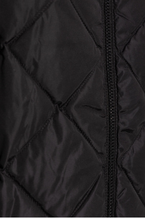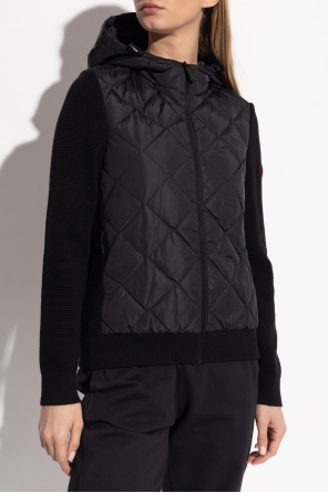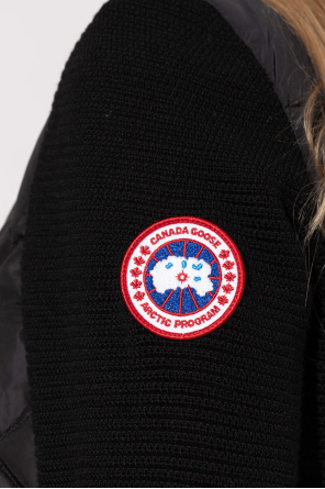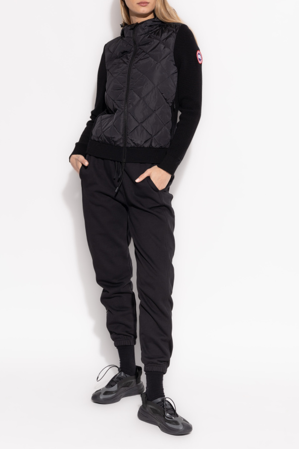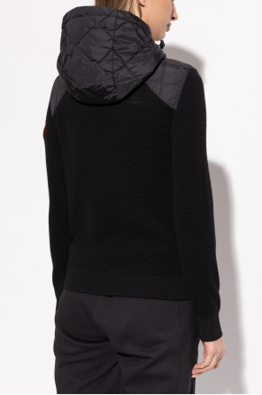 Canada Goose的黑色羊毛连帽毛衣,配有绗缝面料元素、拉链开合、两个拉链前袋、抽绳兜帽,饰以白红蓝色logo贴花。罗纹底边及袖口。