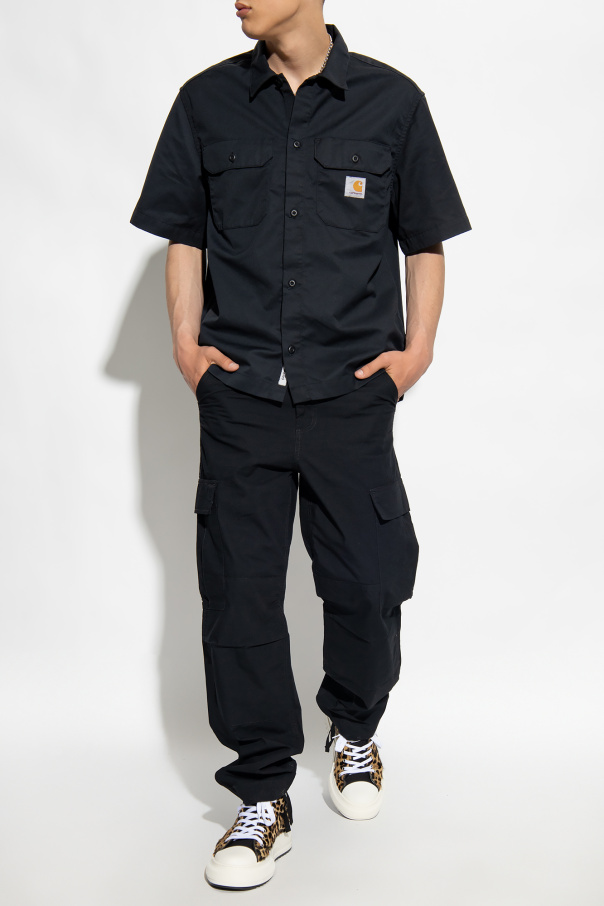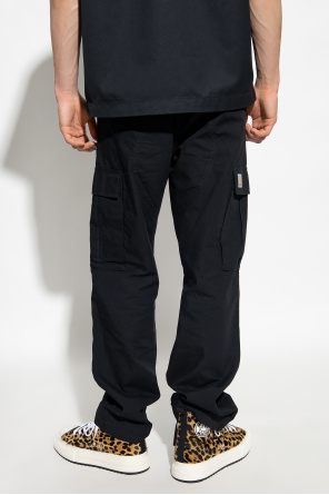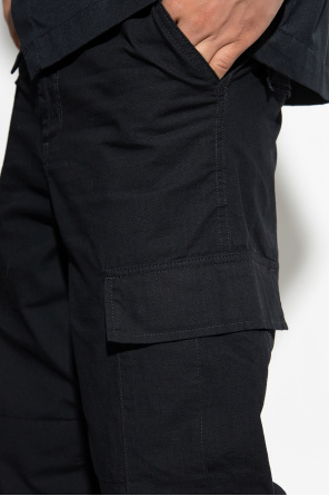 Black cargo trousers from Carhartt WIP. Made of cotton with a relaxed fit, this pair features a logo patch, a zip fly with a button, two slip pockets, four flapped pockets with snaps and drawstring cuffs.