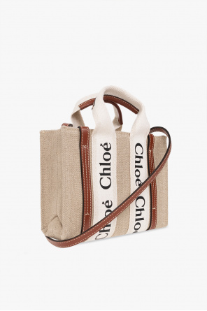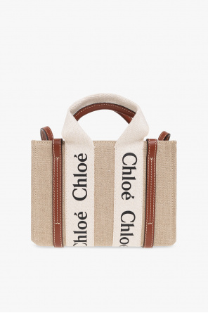 Beige, brown and cream ‘Woody Mini’ shoulder bag from Chloe. Crafted from linen and trimmed with calf leather, this design features a printed black logo, two half-round handles, an adjustable strap and one internal compartment with a slip pocket.