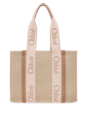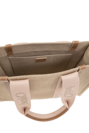 Beige and light pink ‘Woody Medium’ shopper bag from Chloe. Made of linen with calf leather trims, this model features a logo embroidery, two half-round handles and one internal compartment with one slip pocket.