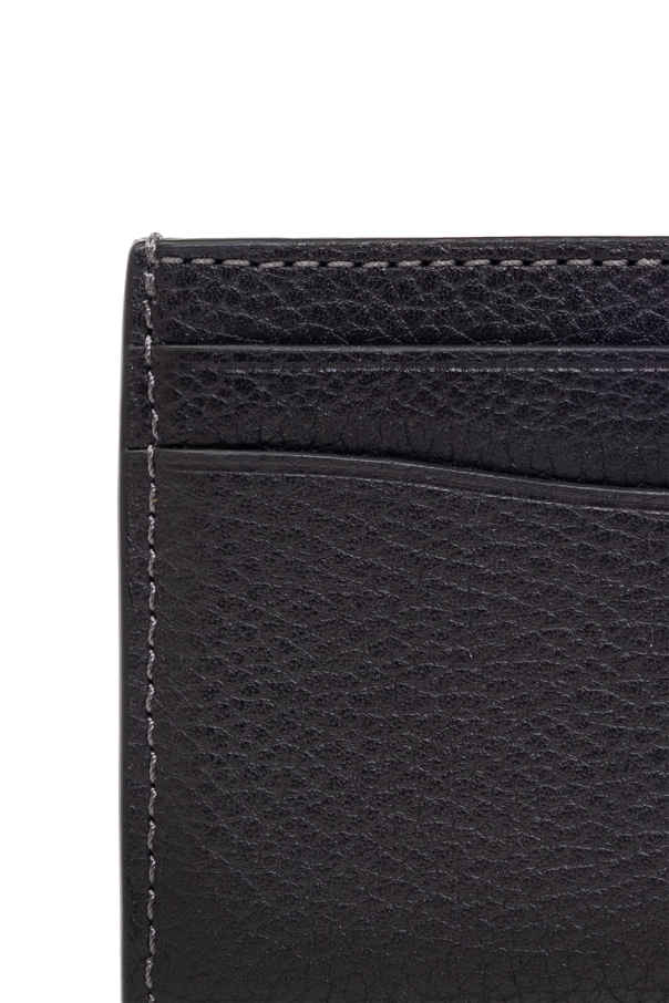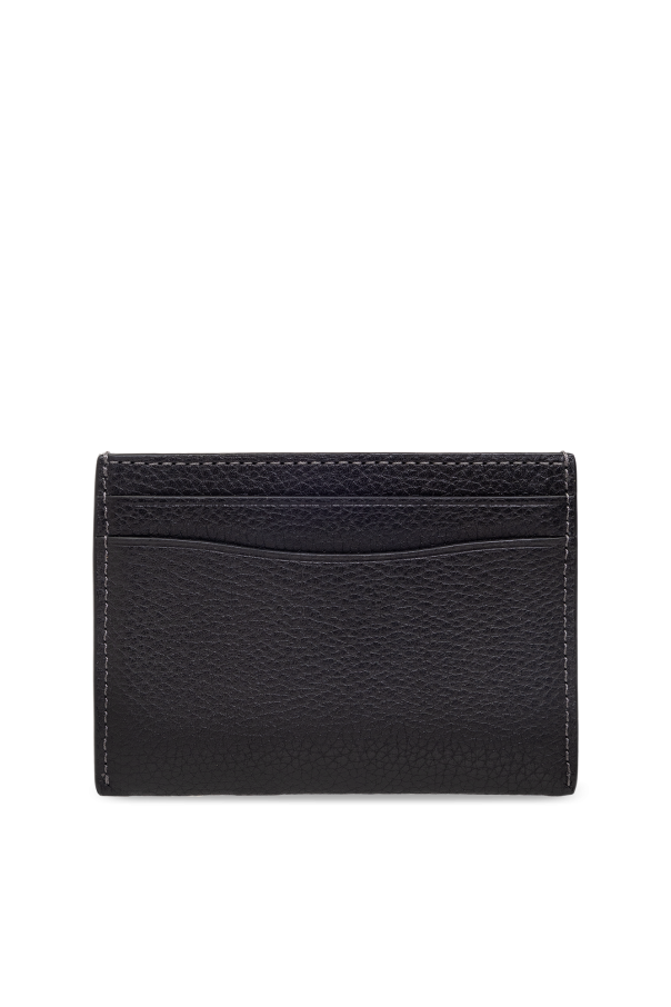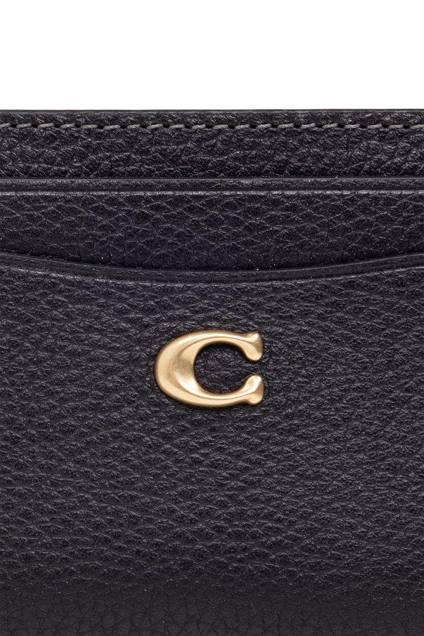 Black card case from Coach. Crafted from leather, this item features a gold-tone logo plaque on the front and five card slots.