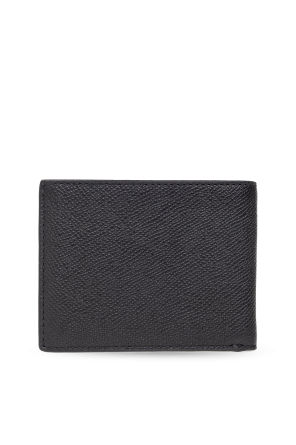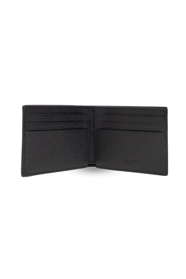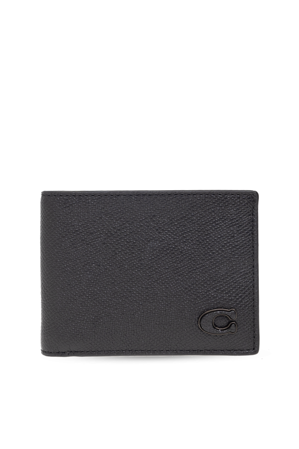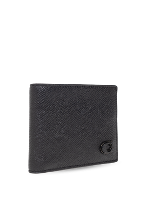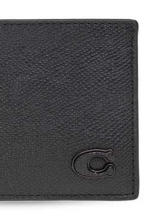Black folding wallet from Coach. Made of leather, this item fastens via a snap and features a tonal logo plaque on the front. It is complete with one bill gusset, two slip pockets and six card slots inside.