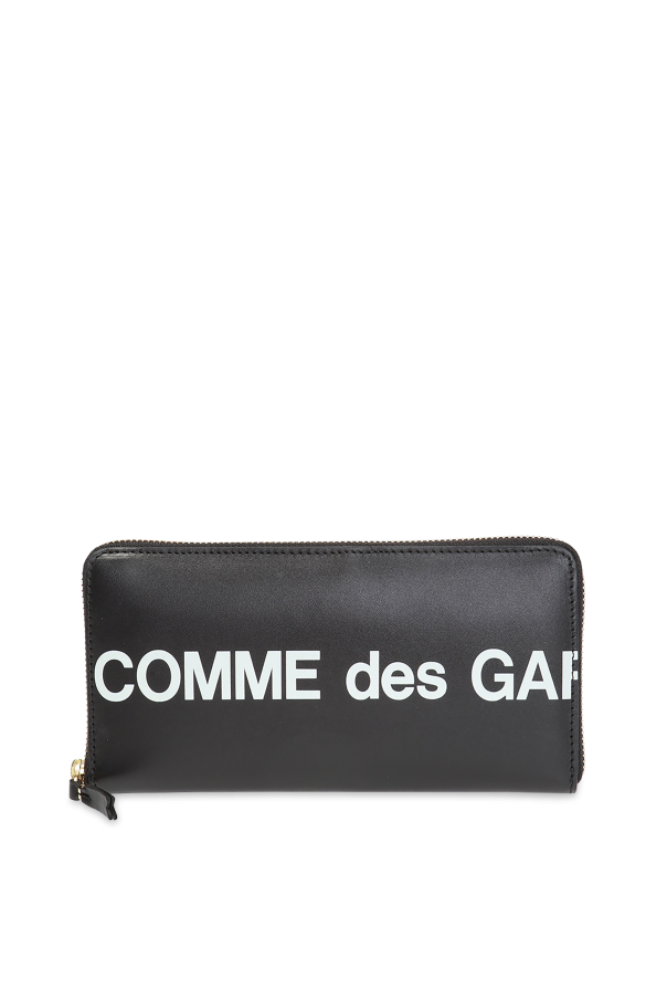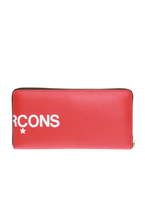 Comme des Garçons的红色真皮拉链钱包,饰以白色印花标识。内有一个钞票位、一个按扣零钱袋、两个插袋和六个卡位。