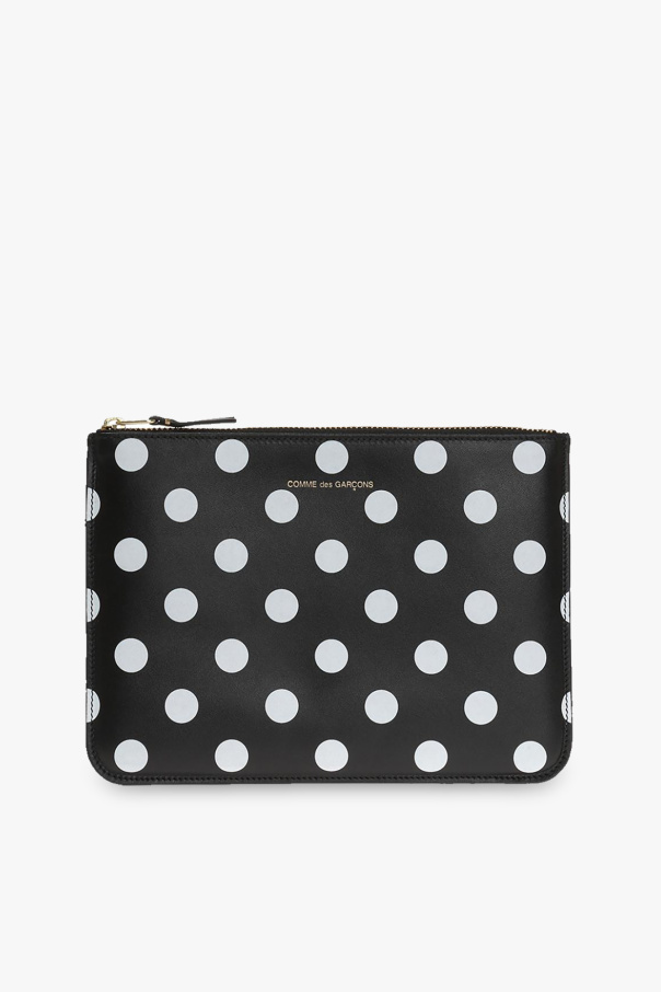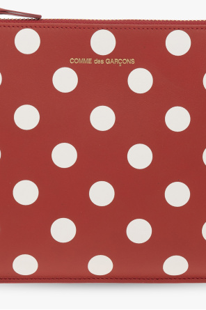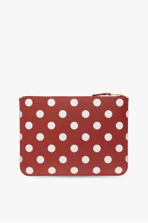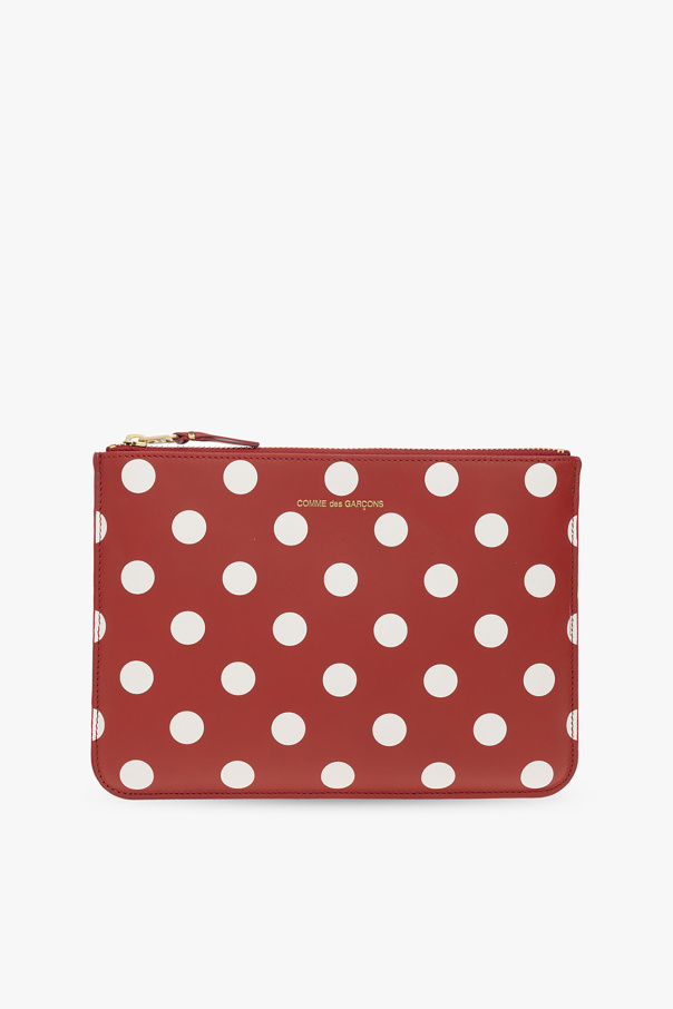 Red pouch from Comme des Garcons. Crafted from leather, this design features a white polka dot pattern, a zip fastening, a gold-tone logo print and one internal compartment.