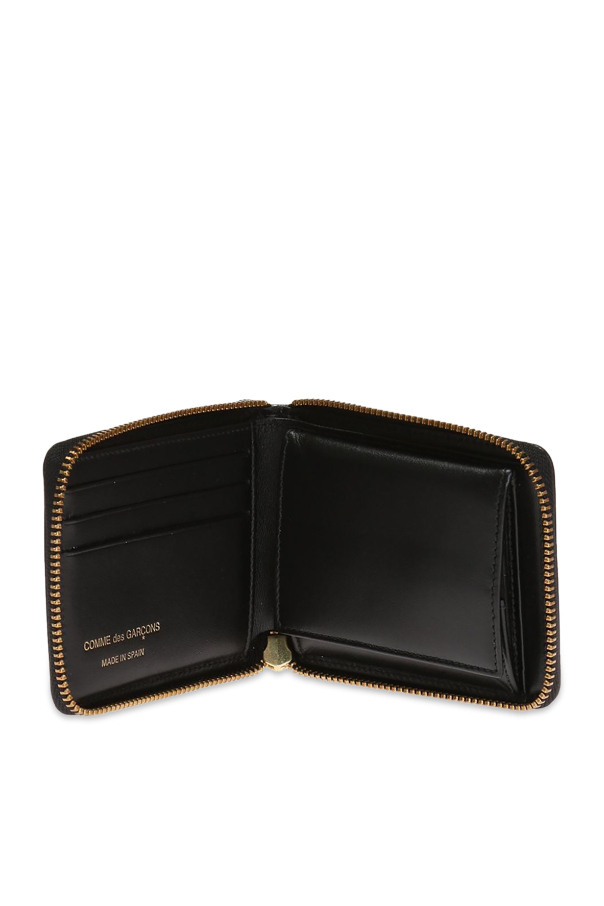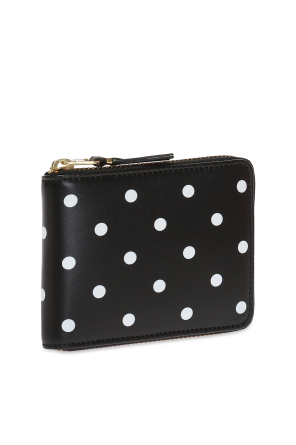 这款黑色钱包采用CommedeGarçons(川久保玲)白色圆点图案设计。由牛皮制成。拉链式固定。内部有钞票隔层,1个按扣硬币口袋,1个滑动口袋和3个卡槽。金色金属配件。