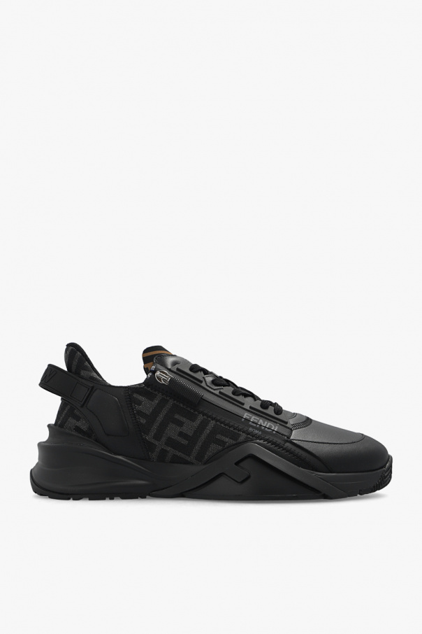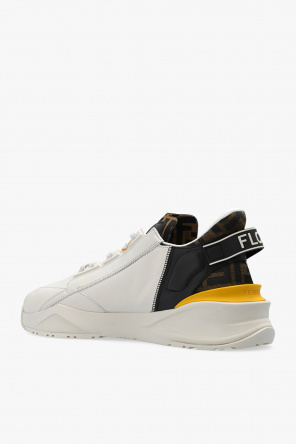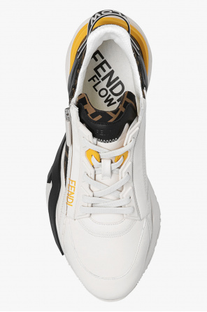 Cream, brown and black ‘Flow’ sneakers from Fendi. Crafted from leather and trimmed with rubber elements, this lace-up model sits on a cream and black rubber sole and features logo detailing on the tongue and side, a monogram jacquard motif on the side and a black and white applique with the model's name accompanied by a yellow logo application at the back.