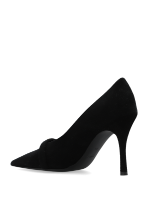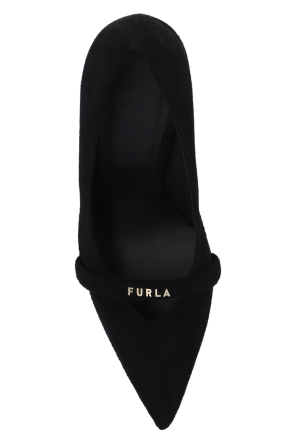 Black ‘Core’ pumps from Furla. Made of suede with a pointed toe silhouette, this model sits on a black rubber sole and showcases a strap and gold-tone logo hardware on the front.