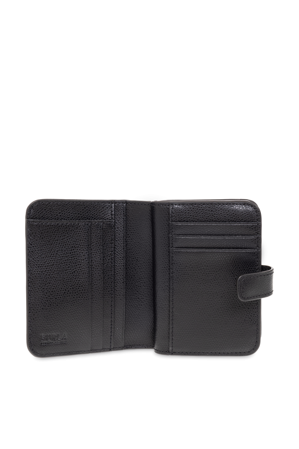 Black wallet from Furla. Made from leather, this design secures with a snap and showcases a gold-tone metal logo plaque on the front, one zip coin pocket and one bill compartment, three slip pockets and six card slots inside.