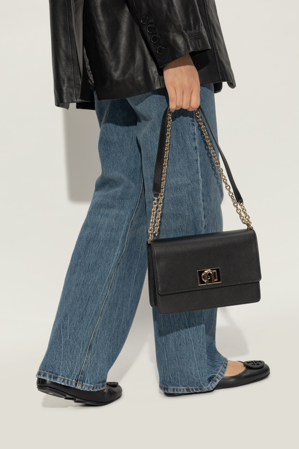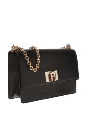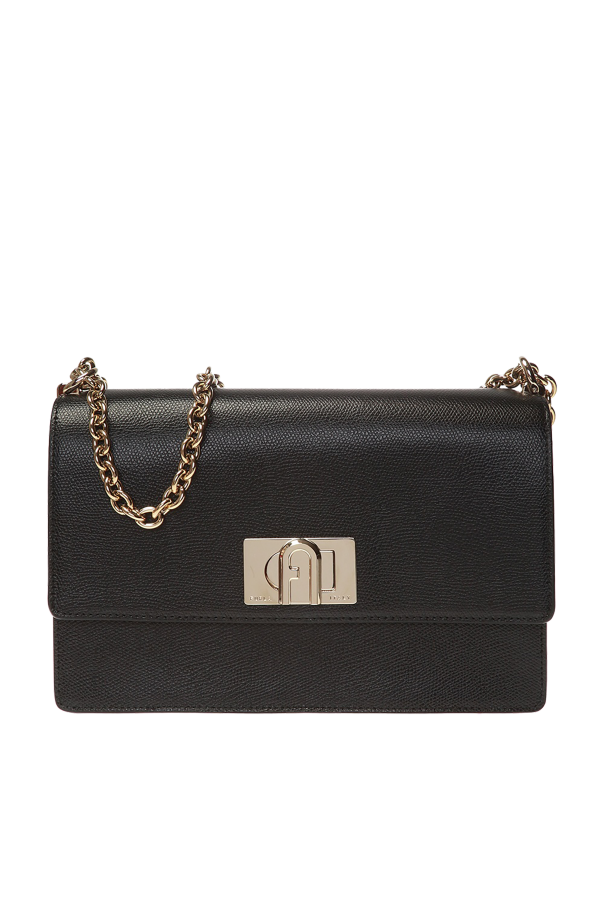 Furla的黑色1927单肩包。皮革制成。饰扣附logo标志。背面附插袋。链式肩带附皮革装饰物。内部附一个隔层和一个拉链袋。金色金属配件。