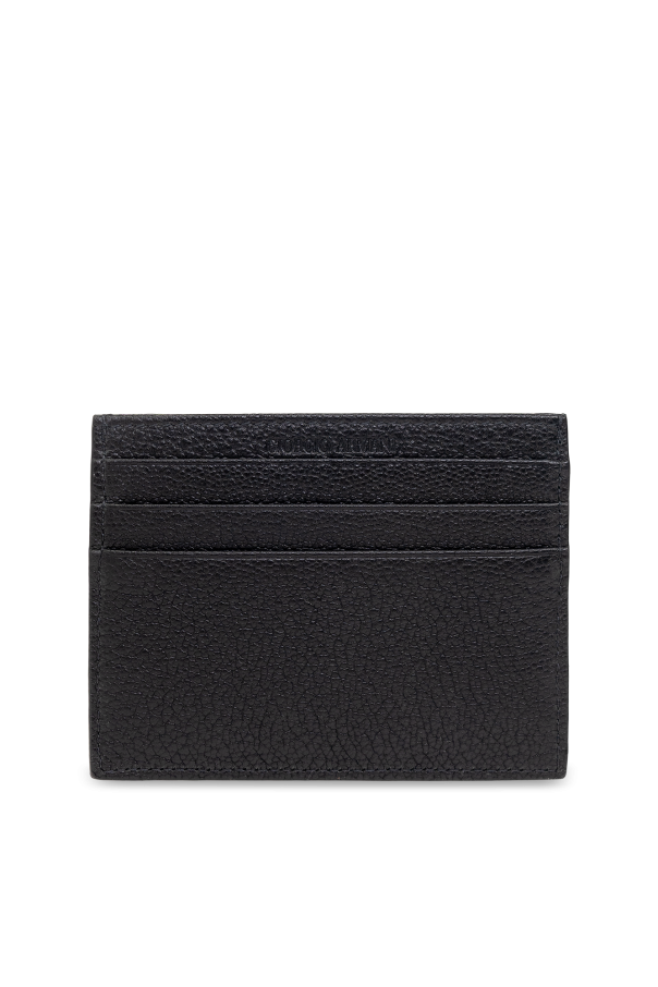 Black card holder from Giorgio Armani. Made of leather, this design features an embossed logo, six card slots and one internal compartment.