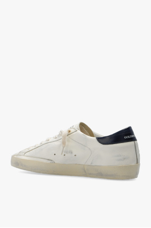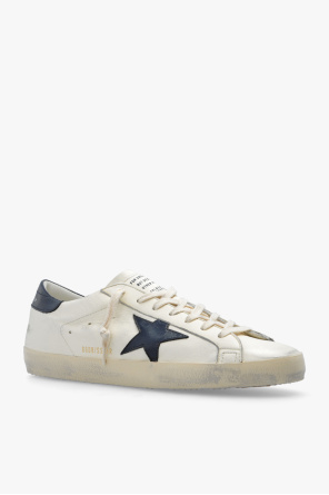 Cream and navy blue ‘Super-star Classic’ sneakers from Golden Goose. Crafted from leather with a vintage effect, this lace-up model sits on a beige and cream rubber sole and showcases a logo print and a navy blue patch with a signature star.