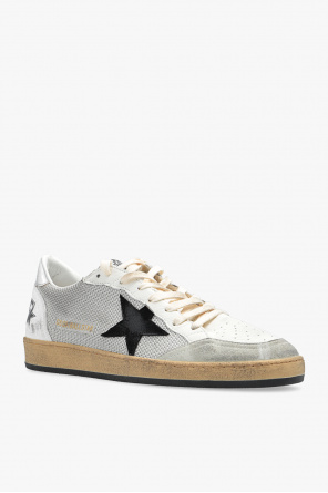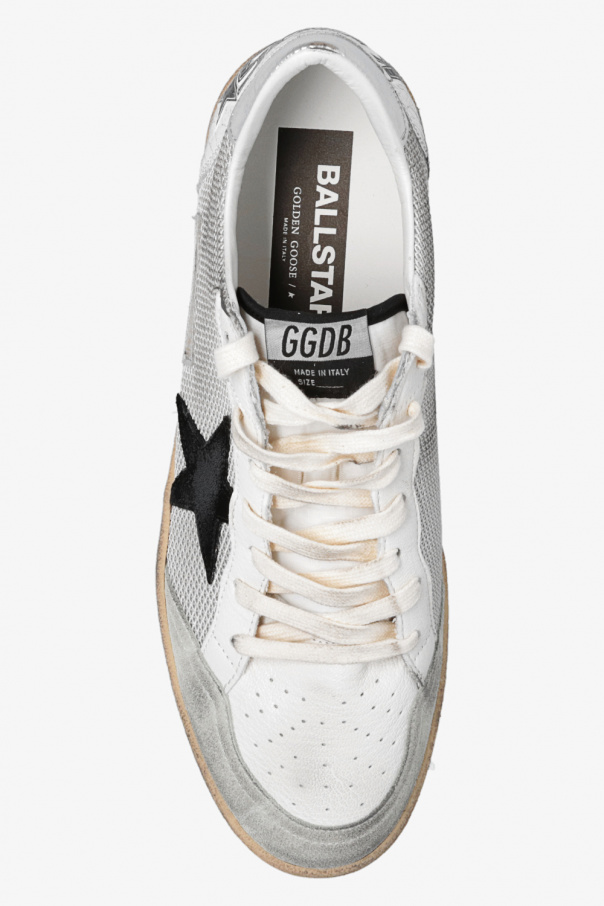 Grey, silver-tone and white ‘Ball Star’ sneakers from Golden Goose. Crafted from leather and fabric, this design features the label’s signature star, logo pattern, silver-tone insert at the back, patch at the tongue, vintage effect and black rubber sole.