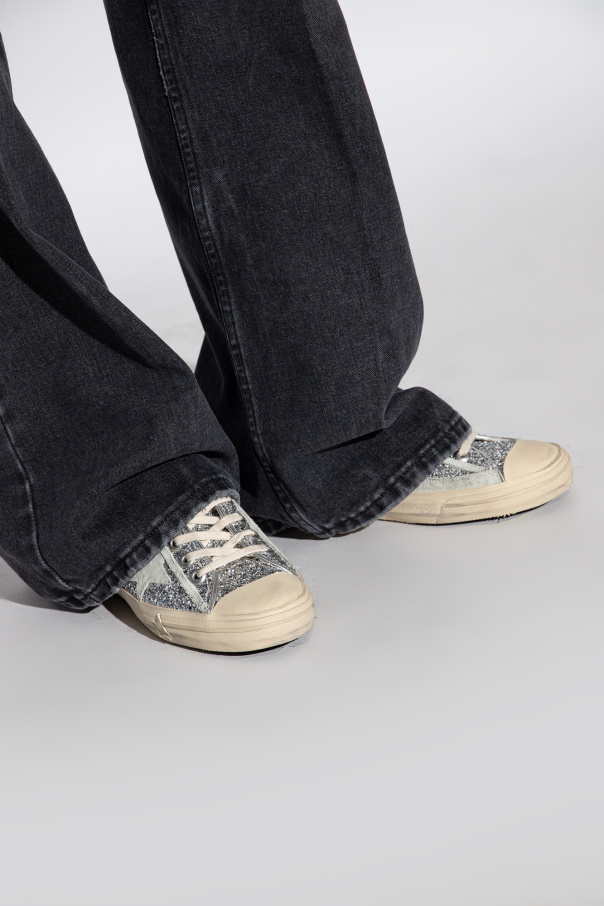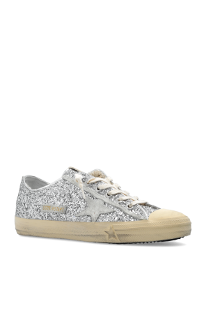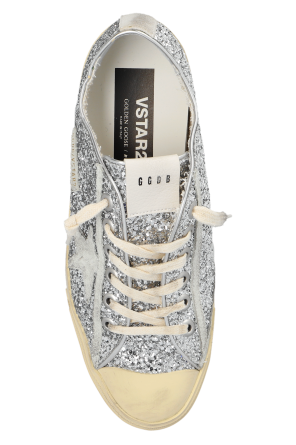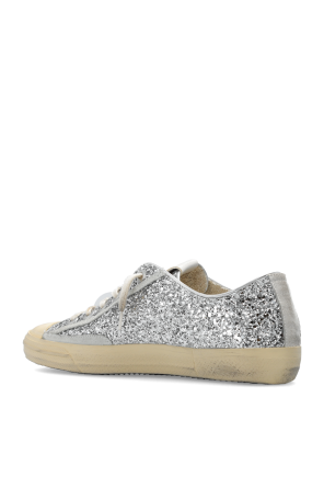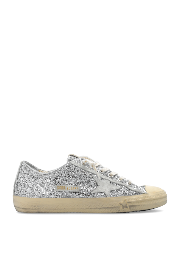 Silver-tone ‘V-Star 2’ lace-up sneakers from Golden Goose. Crafted from leather, this design features glitter, the brand’s signature three stripes, grey star patch, vintage effect and rubber sole in black and beige.
