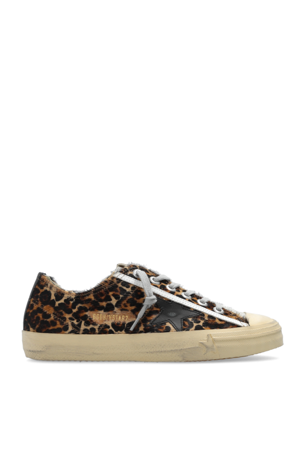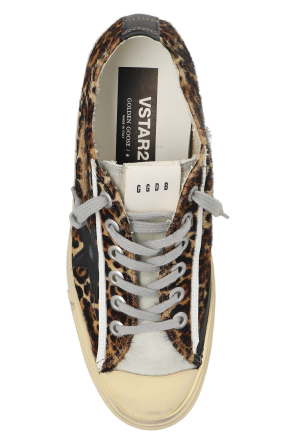Brown, beige and black ‘V-Star 2’ sneakers from Golden Goose. Rendered in hair, suede and leather, this lace-up model sits on a beige and brown rubber sole and showcases an animal motif, printed logo and the brand's signature black star.
