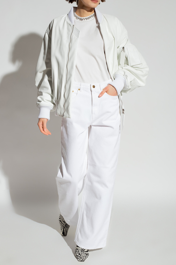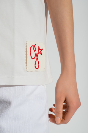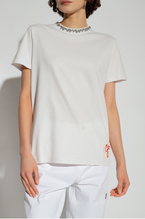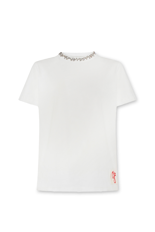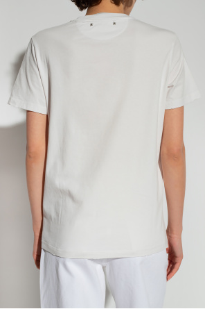 Golden Goose的白色仿旧T恤,短袖设计,采用棉质面料制成,饰有水晶贴花、奶油色和红色徽标贴片以及罗纹圆领。