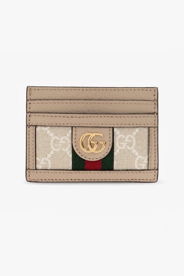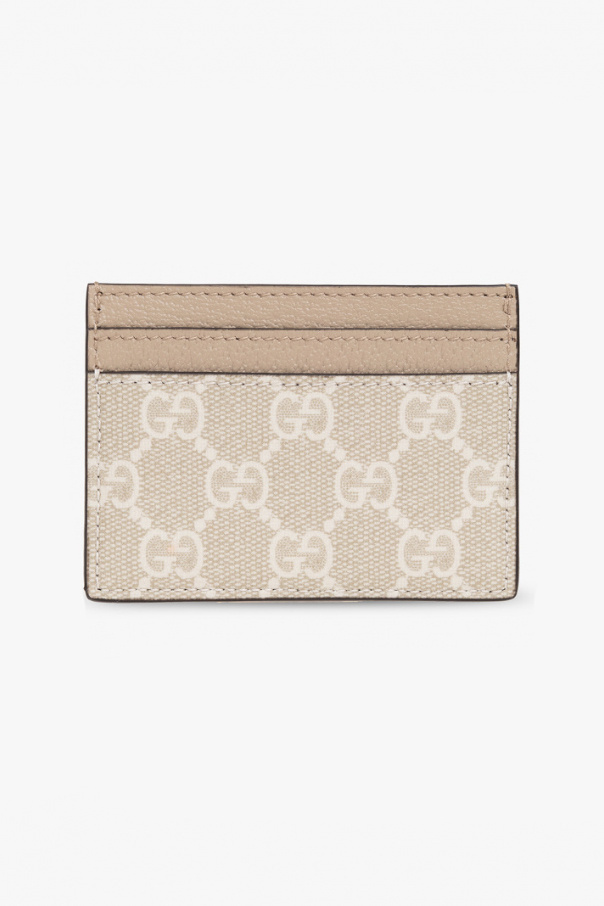 Cream and beige card case from Gucci. Made from GG Supreme canvas and leather, this design features gold-tone logo hardware and green-red-green Web stripe on the front, and five card slots.