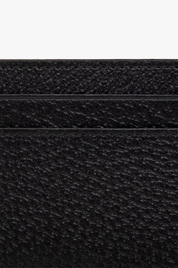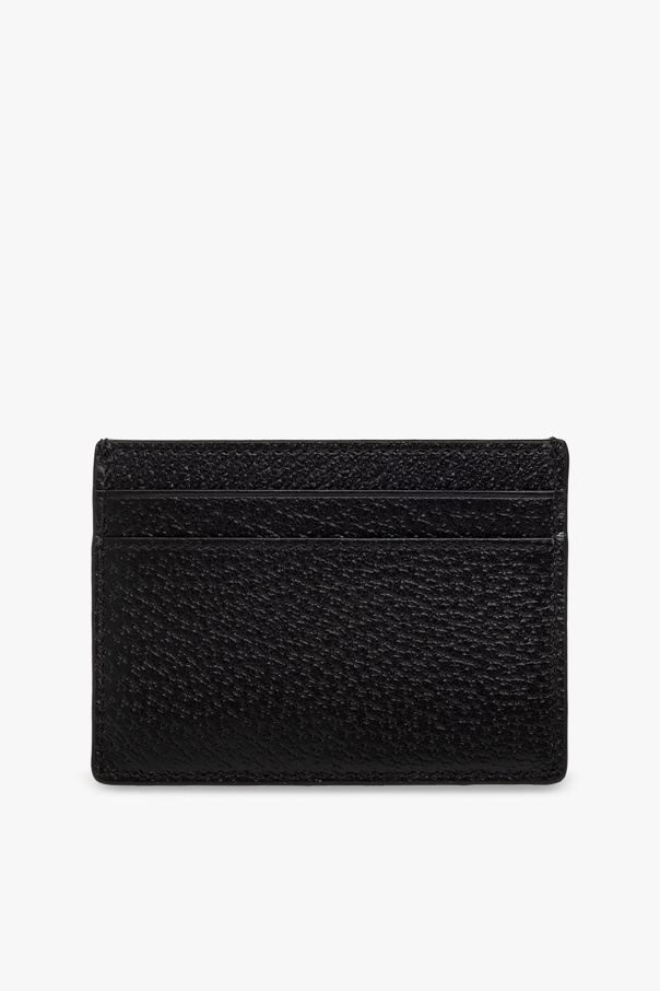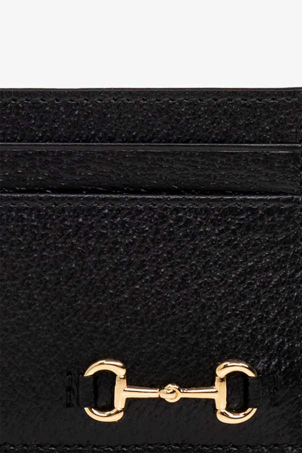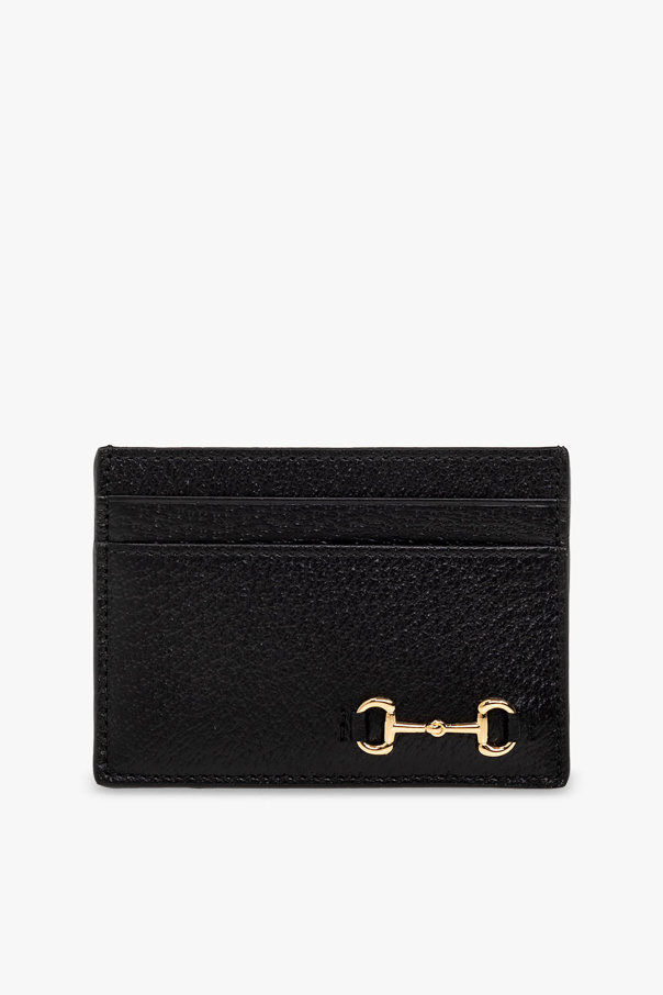 Black card case from Gucci. Made of leather, this item features the brand's signature gold-tone horsebit hardware on the front,, four card slots and one slip pocket.