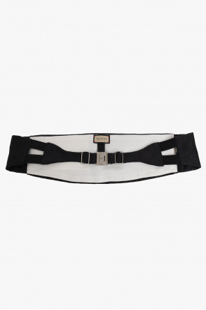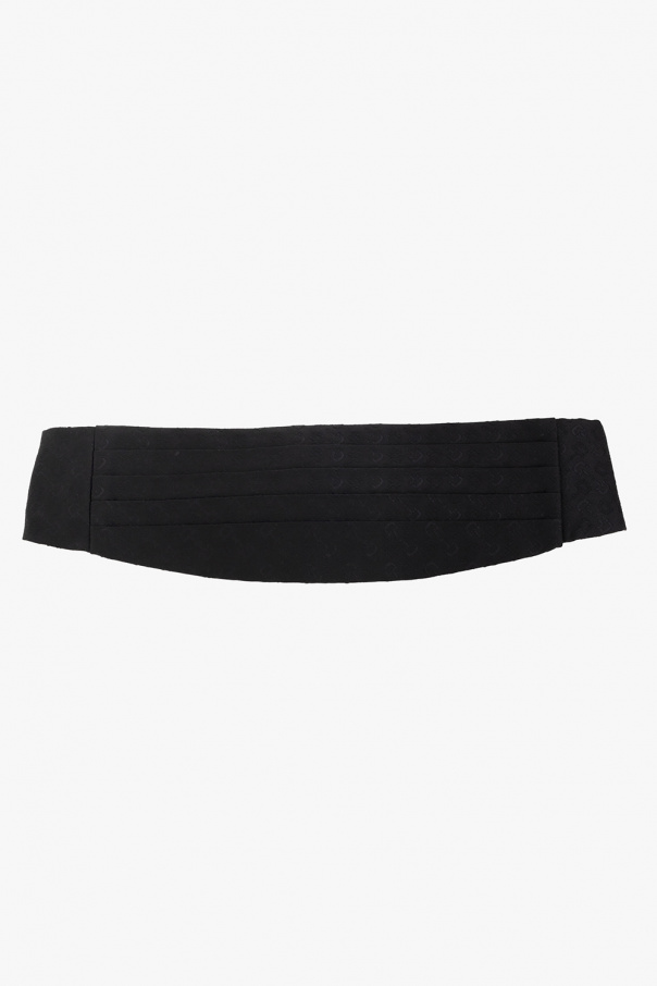 Black pleated tuxedo belt from Gucci. Crafted from a wool and silk blend, this item features an embroidered ‘Horsebit’ pattern and a hook fastening.