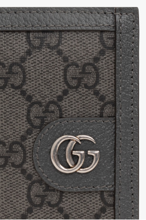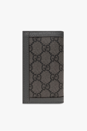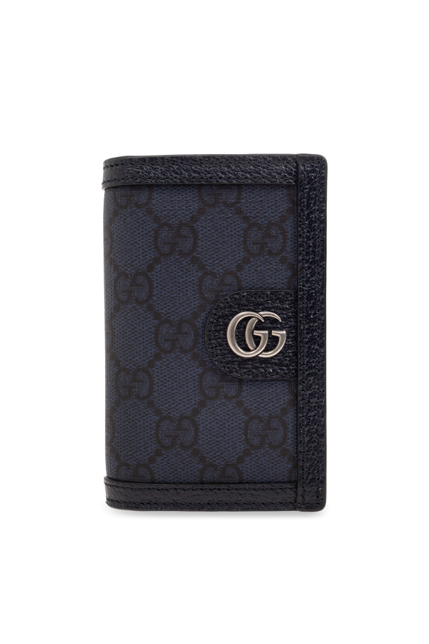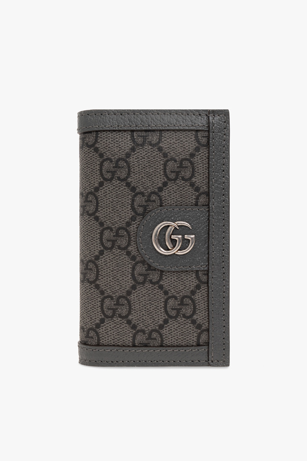 Grey folding card case from Gucci. Crafted in leather and ‘GG Supreme’ canvas, this item features antiqued silver-tone logo hardware on the front and two slip pockets and eight card slots inside.
