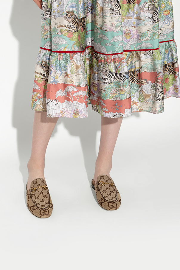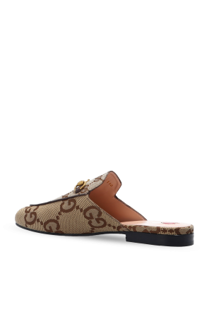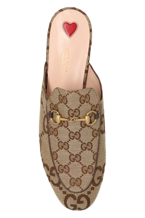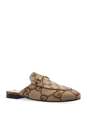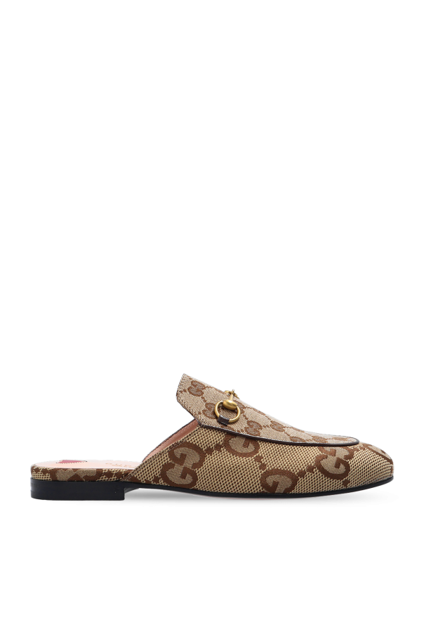 Gucci的米色和棕色'Princetown'拖鞋,采用 “GG Originals” 帆布制成,正面饰有品牌标志性的复古金色马衔扣五金配件,米色和黑色皮革和橡胶鞋底。