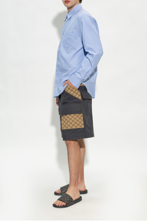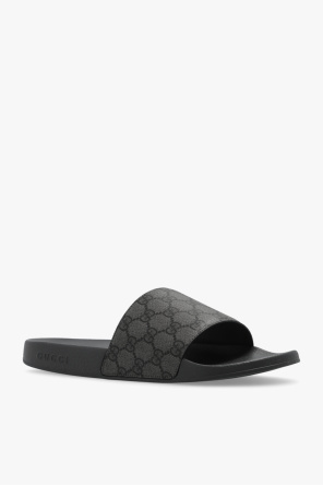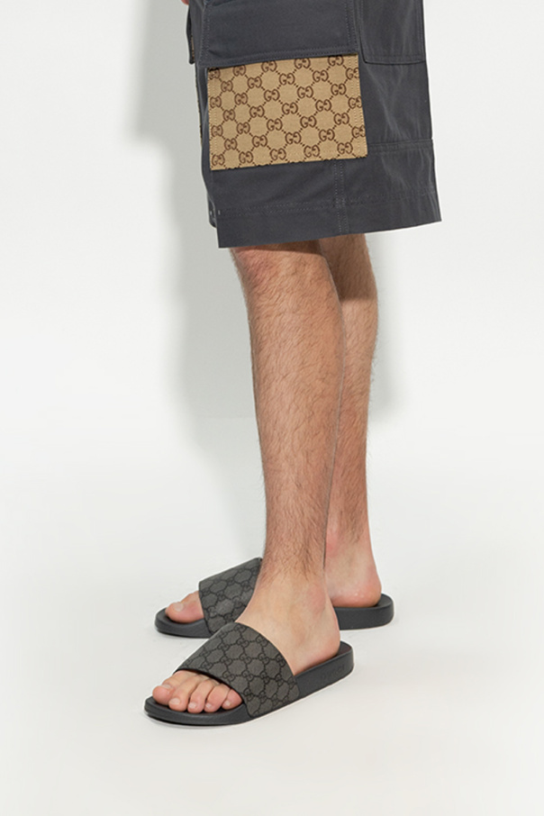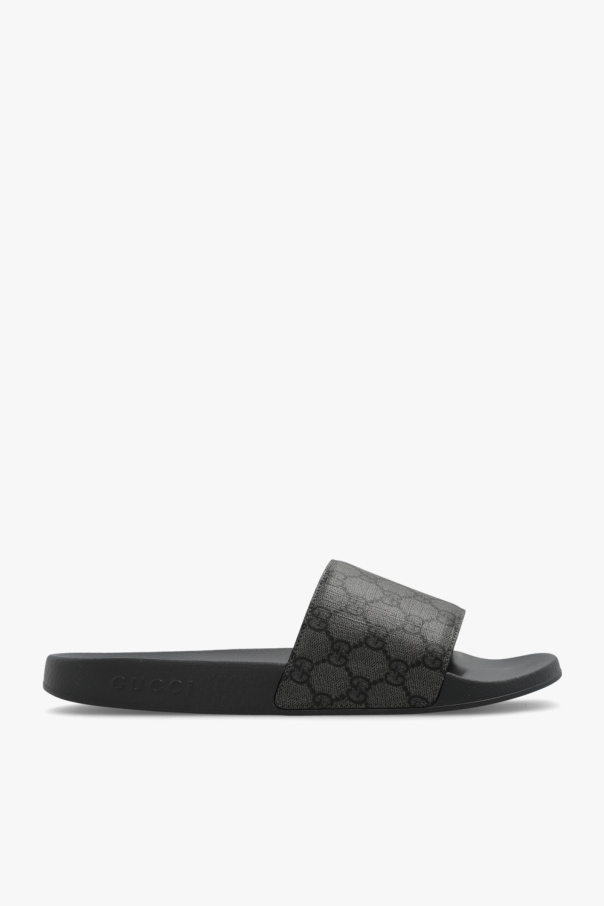 Brown slides from Gucci. Resting on a brown rubber sole, this pair is decorated with a monogram pattern.